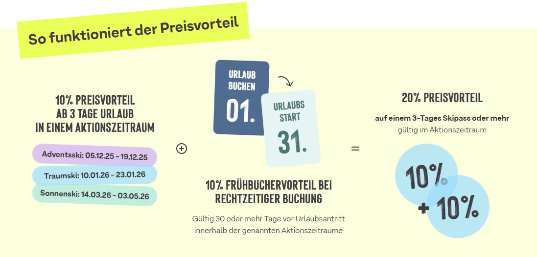 Zusätzlich gibt es weitere 10% Rabatt, insgesamt also 20% Ermäßigung, wenn die Buchung des Skipasses spätestens 30 Tage vor dem ersten Nutzungstag erfolgt.